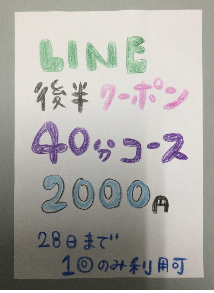 ・2/15〜2/28限定。 ・プリペイドカードでの決済不可。 ・ホットペッパービューティーでご予約の際は「後半LINEクーポン」でお願いします。 - クーポンを使用するには、この画面をスタッフに提示してください。