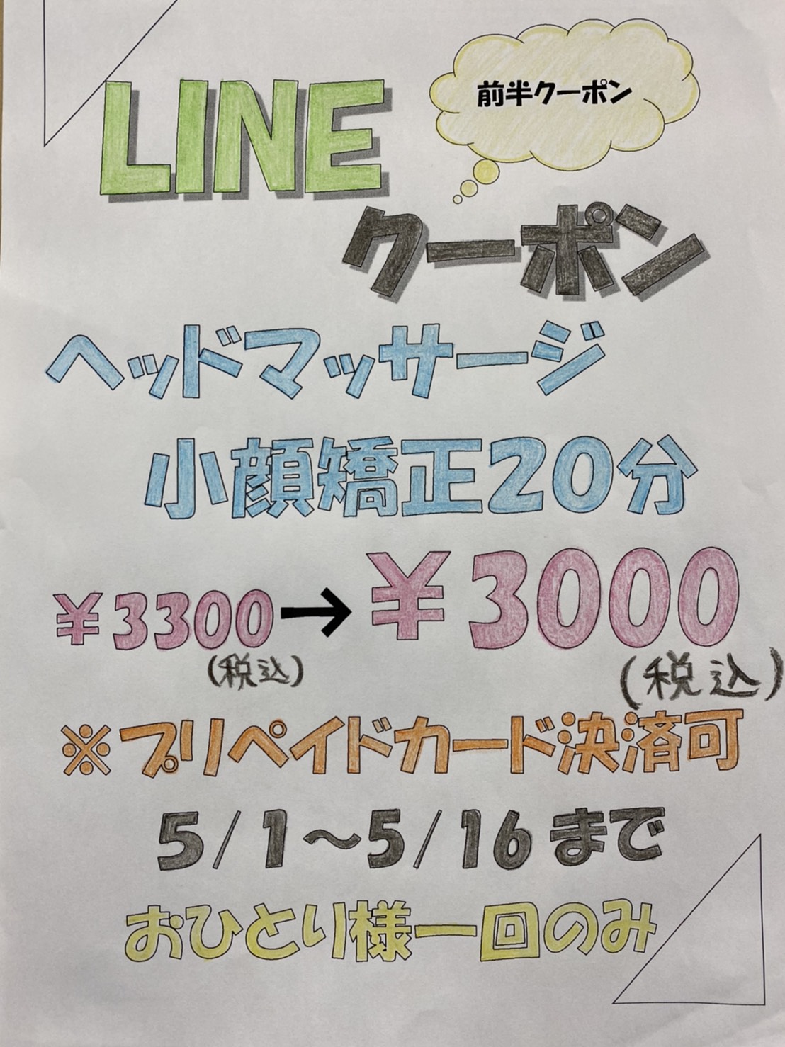 こんにちは。 5月前半クーポンは【ヘッドマッサージ・小顔矯正20分】クーポンになります。 プリペイドカードでの決済可能です!! 当日ご予約はホットペッパービューティー、電話にてご予約可能です。 ※お一人様一回限りになります。 是非お試し下さい。