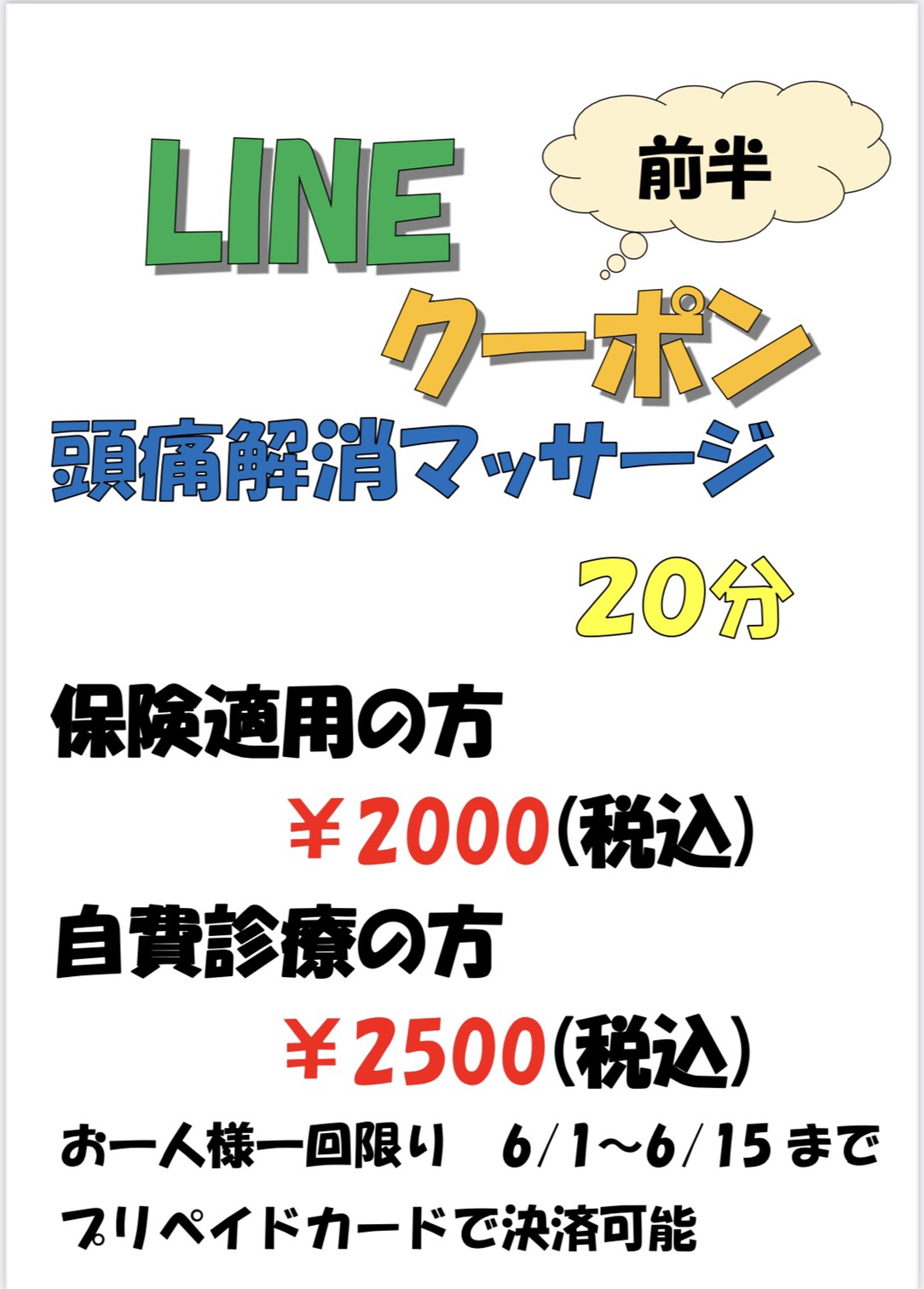 6月前半クーポンは【低気圧による頭痛解消マッサージ20分】クーポンになります。