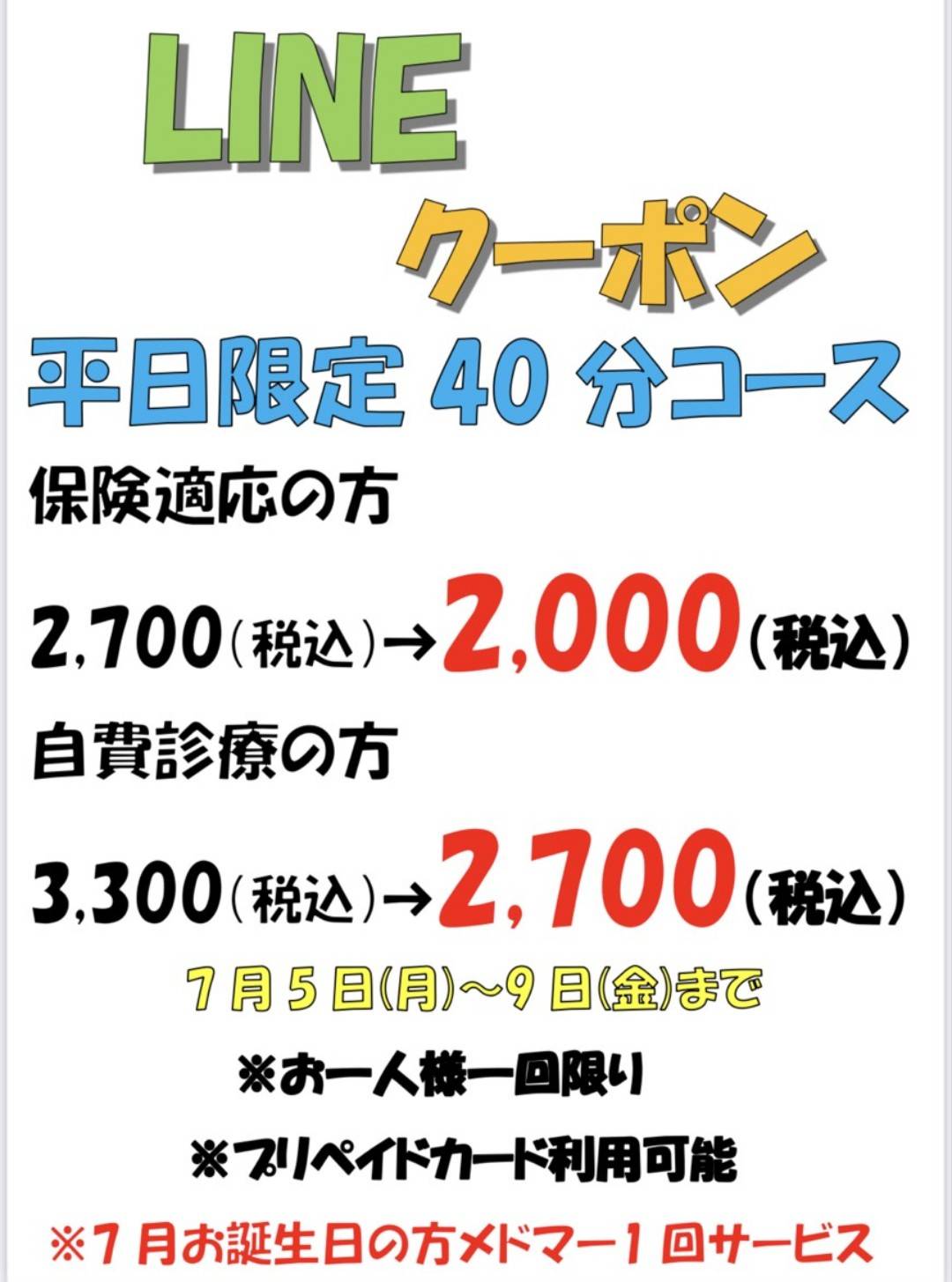保険適応の方 ¥2700(税込)→¥2000(税込)