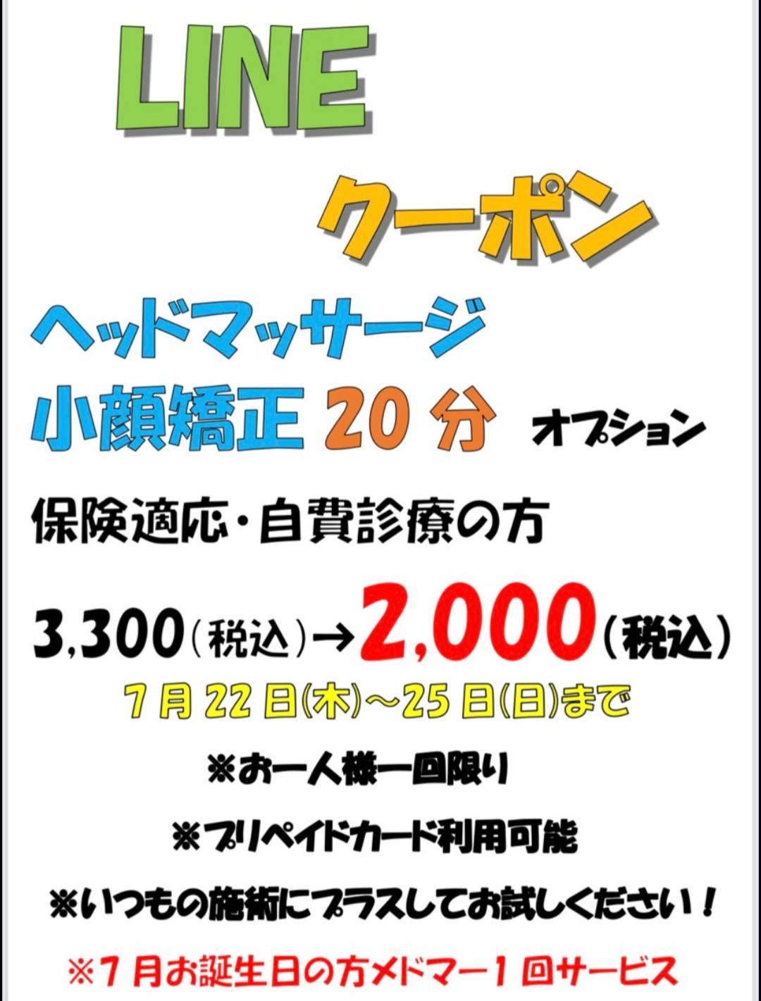 連休限定LINEクーポンは【ヘッドマッサージ・小顔矯正20分オプション】クーポンになります。