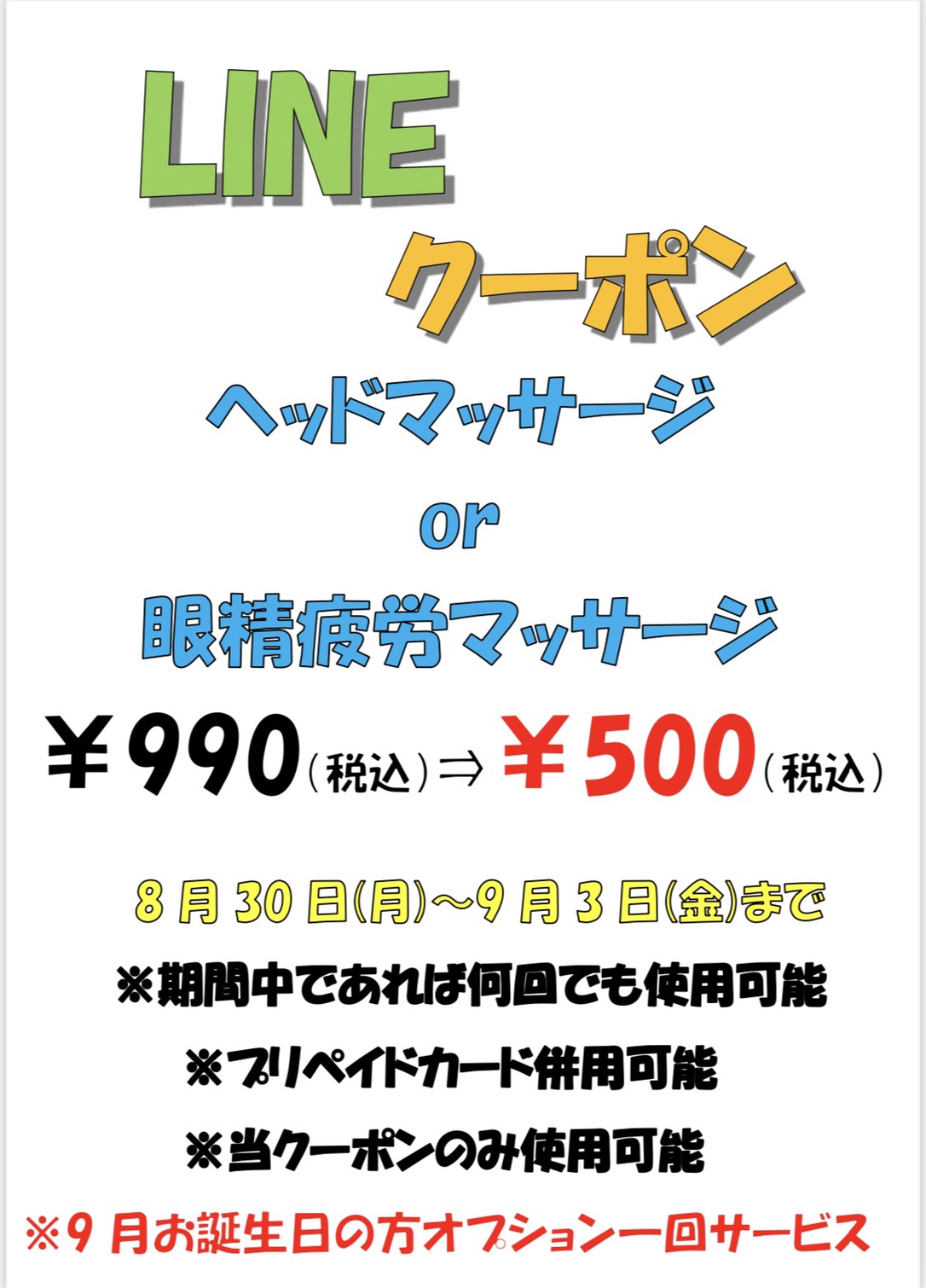 平日限定LINEクーポンは【ヘッドor眼精疲労マッサージ】クーポンになります。